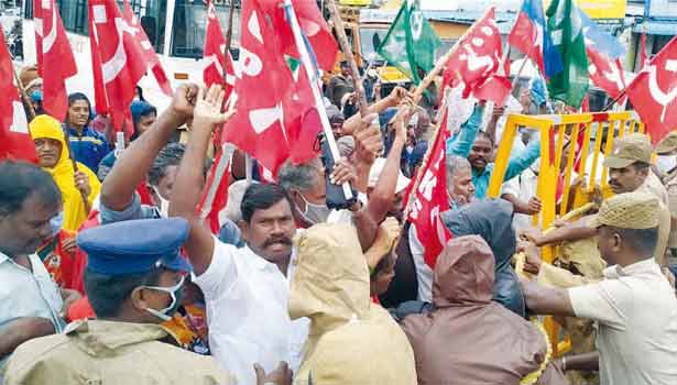 மத்திய அரசு நாடாளுமன்றத்தில் நிறைவேற்றிய 3 வேளாண் சட்டங்களை எதிர்த்து டெல்லியில் போராடும் விவசாயிகளுக்கு ஆதரவாக பெரம்பலூர் மாவட்ட அனைத்து தொழிற்சங்க, விவசாயிகள் சங்கங்களின் போராட்ட குழுவினர் நேற்று கலெக்டர் அலுவலகத்தை முற்றுகையிட்டு போராட்டம் நடத்துவதற்காக, தமிழ்நாடு விவசாயிகள் சங்கத்தின் மாவட்ட தலைவர் செல்லத்துரை தலைமையில் விவசாயிகள், தொழிலாளர்கள் பெரம்பலூர் புதிய பஸ் நிலையத்தில் ஒன்று கூடினர். பின்னர் அவர்கள் கலெக்டர் அலுவலகத்தை முற்றுகையிடுவதற்காக கோஷங்களை எழுப்பியவாறு அங்கிருந்து ஊர்வலமாக புறப்பட்டனர். அப்போது பாதுகாப்பு பணியில் இருந்த போலீசார், அவர்களை பெரம்பலூர் புதிய பஸ் நிலையம் முன்பு சாலையிலேயே இரும்பு தடுப்புகள் வைத்தும், கயிறு கட்டியும் தடுத்து நிறுத்தினர். இதனால் அந்தப்பகுதியில் போக்குவரத்து பாதிக்கப்பட்டது.