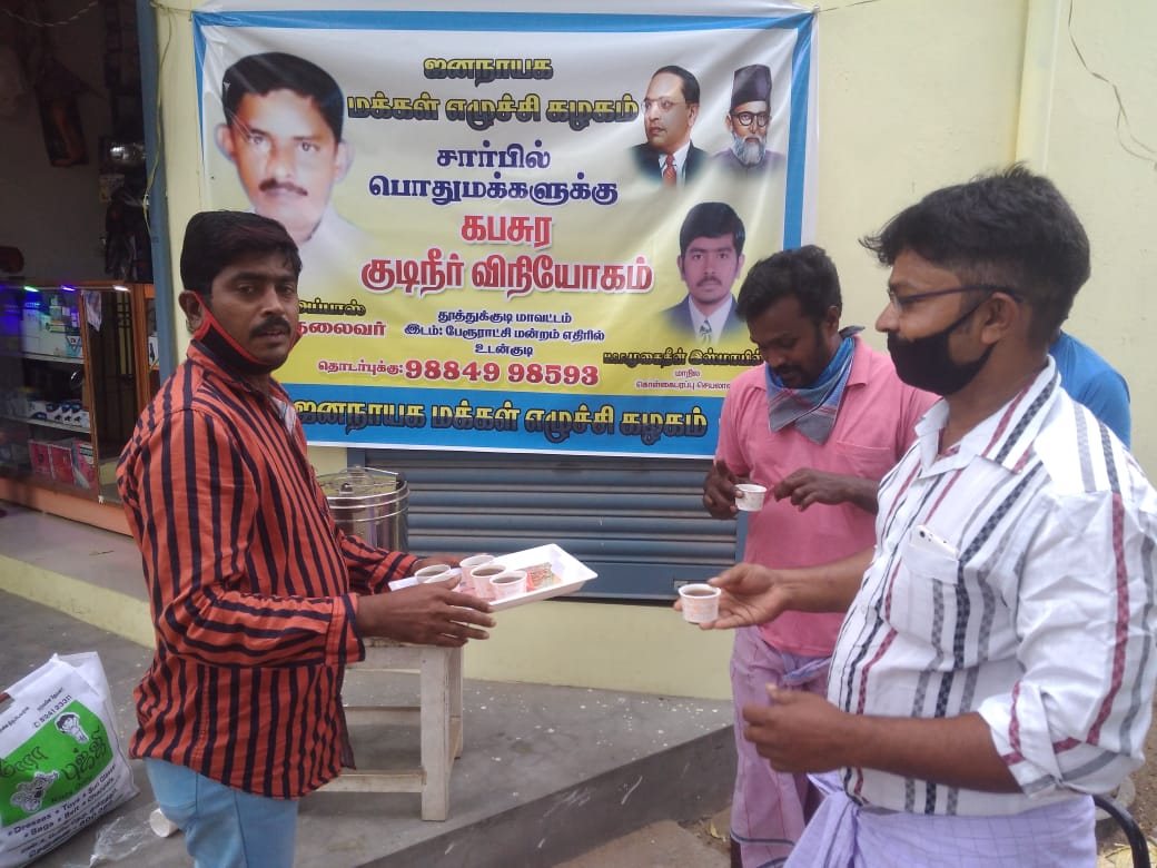 தூத்துக்குடி மாவட்டம், உடன்குடி பேரூராட்சி ஏதிரில் ஜனநாயக மக்கள் எழுச்சி கழகத்தின் சார்பில் மாநில கொள்கை பரப்பு செயலாளர் முகைதீன் இஸ்மாயில் தலைமையில் பொது மக்களுக்கு கபசுர குடிநீர் 200க்கும் மேற்பட்டோர்களுக்கு சமூக இடை வெளியுடன் வழங்க பட்டது . மேலும் இந்த நிகழ்ச்சி நிர்வாகிகள் பாதுஷா , சுயம்பு , இபுறாஹிம் , அல்போன்ஸ் , சிந்தா , மணிமாறன் , அர்சத்கனி , அப்துல் ரஹ்மான் , சேக் முகமது மற்றும் பலரும் கலந்து கொண்டனர்.