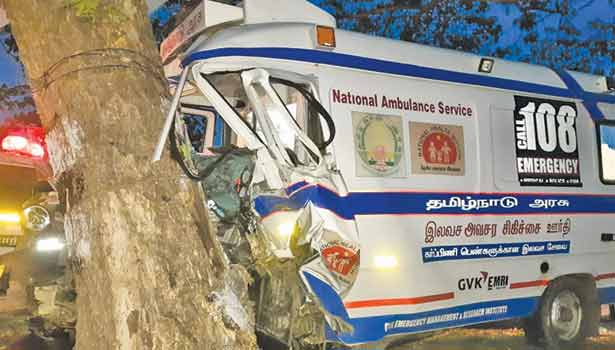 அந்த ஆம்புலன்ஸ் இன்று அதிகாலை கள்ளக்குறிச்சி அரியபெருமானூர் ஏரிக்கரை அருகே சென்று கொண்டிருந்தது. அப்போது எதிர்பாராதவிதமாக ஆம்புலன்சின் டயர் வெடித்தது. இதில் டிரைவரின் கட்டுப்பாட்டை இழந்த ஆம்புலன்ஸ் தாறுமாறாக ஓடி சாலையோரத்தில் இருந்த மரத்தில் மோதியது.