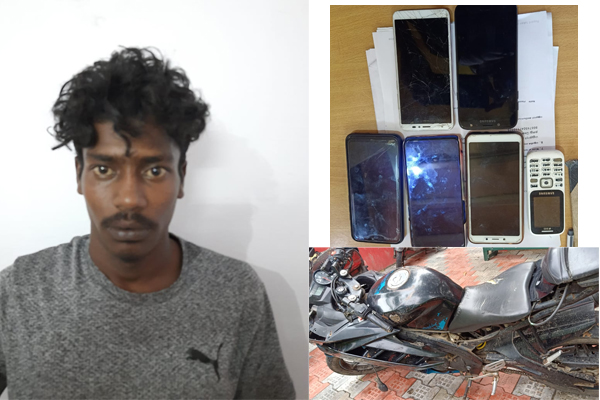 இவர் இரு இடங்களிலும் பைக் மற்றும் வண்ணாரப்பேட்டை, ஏழுகிணறு பகுதியில் ஆறு மொபைல்போன்கள் மற்றும் தங்க கம்மல் திருடியது விசாரணையில் தெரியவந்தது. போலீசார் அவரை கைது செய்து அவர் மீது வழக்கு பதிவு செய்து புழல் மத்திய சிறையில் அடைத்தனர்